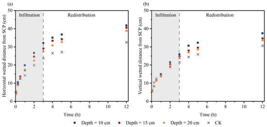 Wetted distances for different burial furrow depths. (a) represents the horizontal direction and (b) represents downward direction.