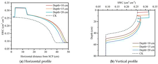 Under different burial furrow depths, the characteristics of soil water distribution at horizontal and vertical profiles located at varying distances from the SCP are shown in Figure 10. No significant change was observed in the mean SWC in areas within 20 cm from the surface. Beyond 20 cm from the surface, the SWC increased with increasing burial furrow depth. However, the changed in SWC between 20 and 30 cm from the surface were small. Increasing burial furrow depths had a greater effect on the vertical wetted depth but a smaller effect on the horizontal soil water content.