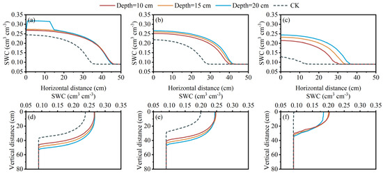 Soil water distribution at horizontal and vertical profiles located at varying distances from the SCP, with different burial furrow depths. (a–c) Horizontal profile at (a) 20 cm, (b) 30 cm, and (c) 40 cm from the surface. (d–f) Vertical profile at (d) 20 cm, (e) 30 cm, and (f) 40 cm from the SCP.