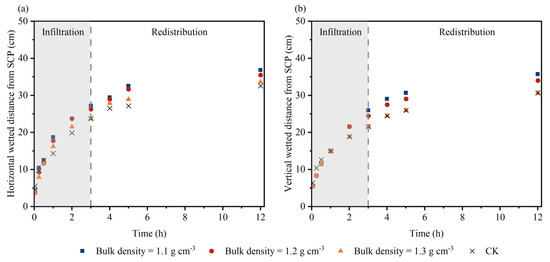 Changes in the wetted distance (both horizontally and vertically) over time are presented in Figure 11. After irrigating for three hours, the horizontal wetted distance saw increases of 14.56%, 10.72%, and 0.04% as the backfilling-soil bulk density increased from 1.1 to 1.3 g cm−3 when compared to the control (CK). Similarly, the vertical wetted distance saw increases of 20.37%, 13.41%, and 0% under the same conditions. During the water redistribution period, after 12 h, the horizontal wetted distance increased by 13.06%, 8.94%, and 3.23% and the vertical wetted distance increased by 16.47%, 10.86%, and 0% when the backfilling-soil bulk density reached 1.1, 1.2, and 1.3 g cm−3, respectively, compared to CK. The results demonstrate that the wetted distance declined as the bulk density of the backfilling soil increased. This effect was more prominent in the vertical direction compared to the horizontal direction. The backfilling-soil bulk density primarily affected the migration speed of the wetting front. Specifically, a higher backfilling-soil bulk density resulted in a slower migration speed of the wetting front.
