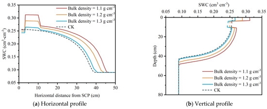 Soil water distribution along the SCP’s horizontal and vertical profiles under different backfilling-soil bulk densities.