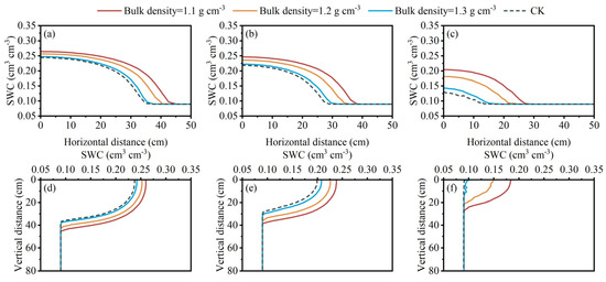 Soil water distribution at horizontal and vertical profiles located at varying distances from the SCP, with different backfilling-soil bulk densities. (a–c) Horizontal profile at (a) 20 cm, (b) 30 cm, and (c) 40 cm from the surface. (d–f) Vertical profile at (d) 20 cm, (e) 30 cm, and (f) 40 cm from the SCP.