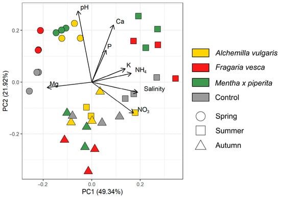 The majority of the measured soil chemical parameters showed statistically significant differences in their levels between sampling points during the vegetative period, irrespective of the treatment (Supplementary Materials Table S1, Figure 1). Only P levels were independent of the seasonal factor. Spring time samples were the most different from the other two sampling timepoints, which also emerged from the PCA (Figure 1). The observed pH values decreased significantly during the vegetative season (on average, from 6.30 in May to 5.74 in September). Both nitrogen forms showed a concentration peak in summer (46.25 g/L for N-NO3 and 227.50 g/L for N-NH4). However, while nitrate levels remained stable till the end of the season (on average 41.08 g/L), the concentration of N-NH4 decreased significantly, reaching a level comparable to that observed in spring at the autumn sampling time. Similar trends were observed for potassium and calcium levels, which also showed the highest concentrations during summer, while the concentrations observed in autumn were either comparable (for K) or lower (for Ca) than at the beginning of the vegetative season. Mg concentration followed a different pattern, with a decrease in summer.