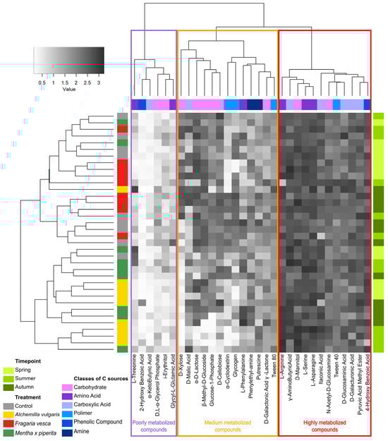 The majority of the carbon sources present in the Biolog Ecoplates were metabolized at specific levels regardless of the timepoint during the vegetative season, allowing us to group them according to their metabolization level as follows: poorly, medium, and highly metabolized (Figure 2). The three groups included various classes of C sources (Figure 2, upper colored strip). The discrimination of the C sources according to the sampling timepoint or treatment did not indicate specific clusters. However, the majority of C sources resulted in groups independent of both A. vulgaris and F. vesca (about 1/3 of C sources for each mulching species), irrespective of the sampling point (Figure 2, left side, colored strip).