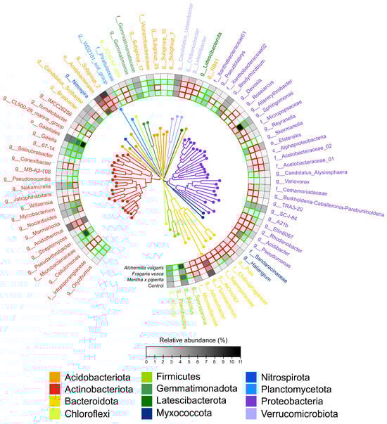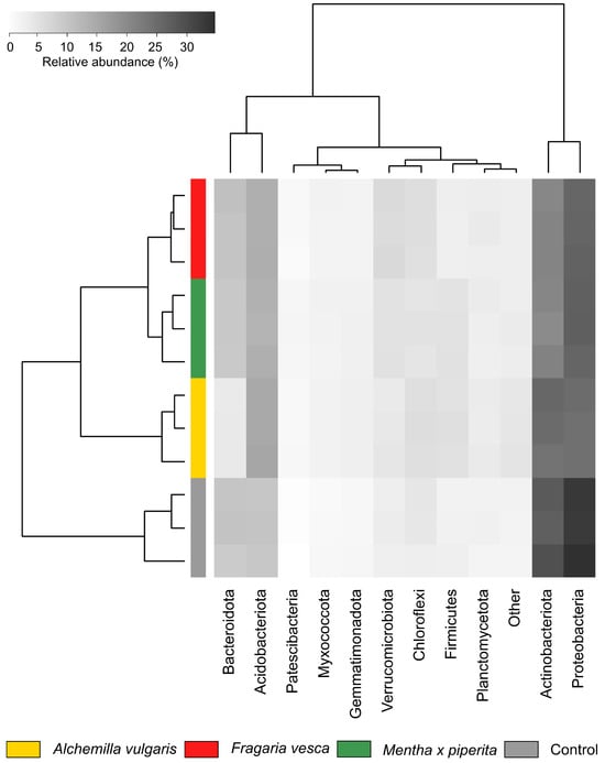 Even though 39 different bacterial phyla were identified, only 11 of them constituted at least 1% of the whole community (Supplementary Materials Table S3). Interestingly, the abundance of all of them was significantly different, but the three analyzed samples for each treatment were clustered together, confirming a consistent impact of the living mulch (Figure 3, left side, colored strip). M. x piperita and F. vesca bacterial populations clustered together, separate from A. vulgaris, and all were clearly separated from the control (Figure 3, left side clustering). Proteobacteria was the most abundant phylum, especially in the control treatment (33.6%), and it was significantly reduced by about 25% with the introduction of any living mulch, especially A. vulgaris. Actinobacteriota, the second most abundant phylum, was most commonly present in the natural covered soil (28.3%) and significantly less abundant in A. vulgaris (25.0%), F. vesca (20.1%), or M. x piperita (20.8%) treatments. Acidobacteriota, the third major phylum, was, on the contrary, less abundant in the control (10.0%) and increased by M. x piperita (13.5%), F. vesca (14.1%), and A. vulgaris (15.3%) treatments. Changes in the abundance of less present phyla (e.g., Bacteroidota, Chloroflexi, and Firmicutes) were also evident, especially for Bacteroidota, which were much more abundant in soil mulched with F. vesca and M. x piperita than in the other treatments. The other four phyla each accounted for less than 5% of the community. Myxococcota and Planctomyceotota were enriched to a similar level (about 2.4%) by all living mulches in comparison to the control (about 1.6%). On the other hand, some specific changes were observed for the different living mulching species: Verrucomicrobiota was more abundant in F. vesca, followed by M. x piperita, while Patescibacteria was enriched by M. x piperita, especially when compared to the control.