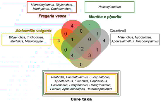 Venn diagrams based on the counts of nematode taxon identified at least once in the samples of soil treated with different living mulches. The taxa specific to each treatment and the core nematode taxa are also listed in boxes.