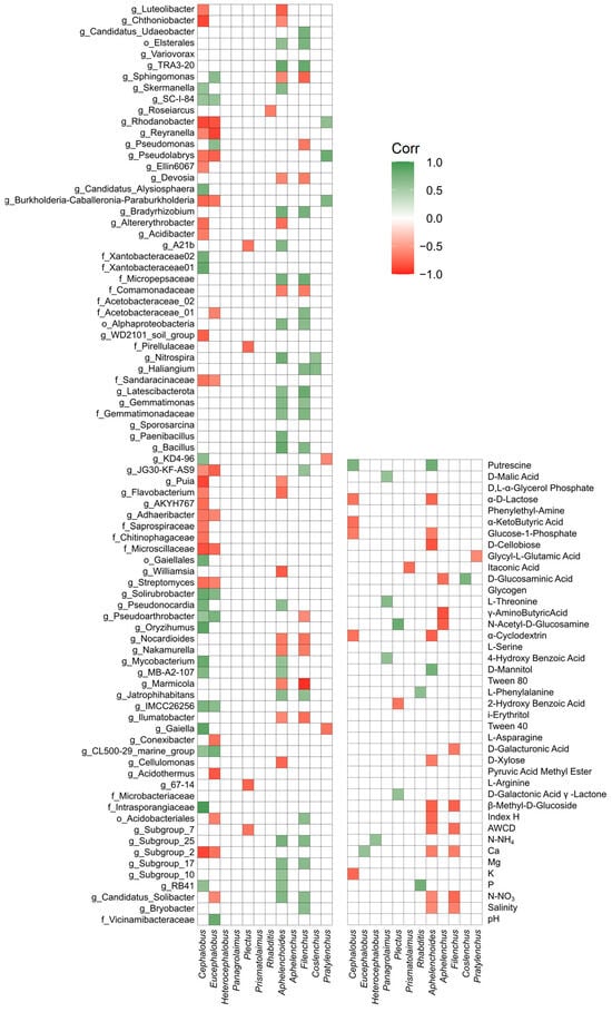 Heatmaps showing the significant correlations (p < 0.05) between soil bacteria and nematode core taxa, microbial activity, and soil chemical data of samples gathered in summer from soil managed with living mulch species or natural cover.