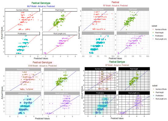 Table 7 also presents the models’ RMSE, R2, and MAE values for plant height, proliferation, number of roots, and root length for the “Festival” cultivar. The R2 values for plant height scored 0.88 for RF, 0.86 for SVM, and 0.84 for RF, while GP showed the lowest R2 at 0.78. The RMSE and MAE values varied by model and exhibited the order GP (0.10) = SVM (0.10) < RF (0.11) < MLP (0.12) for plant height. MAE also showed an order of GP = SVM < RF < MLP, with GP having the lowest MAE. In terms of the RMSE, R2, and MAE values for proliferation, all tested and recorded models performed in the order MLP (0.11; 0.87; 0.10) > RF (0.14; 0.82; 0.12) > GP (0.15; 0.76; 0.12) > SVM (0.16; 0.67; 0.14). It can be deduced from these results that the MLP model was the best among the tested models in terms of its prediction of proliferation owing to its highest R2 (0.87). In terms of the RMSE, R2, and MAE values for the number of roots, all tested and recorded models performed in the order RF (0.11; 0.86; 0.09) > MLP (0.25; 0.63; 0.23)> SVM (0.23; 0.54; 0.21) > GP (0.28; 0.43; 0.25). For the number of roots in the “Festival” genotype, RF showed the highest R2. The same thing happened with the RMSE, R2, and MAE values for root length; all tested and recorded models performed in the order RF (0.10; 0.92; 0.63) > MLP (0.24; 0.52; 0.16) > GP (0.20; 0.47; 0.18) > SVM (0.22; 0.47; 0.19). The RF model outperformed the other models in terms of predicting root length. The overall performance of the models based on all variables (plant height, proliferation, number of roots, and root length) in the “Festival” cultivar can be ranked in the order RF > MLP > GP > SVM. The actual and predicted values of the “Festival” cultivar are shown in Figure 2.