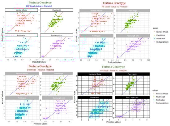 For the “Fortuna” cultivar, in terms of predicting plant height, the random forest (RF) model proved to be the most effective, with the lowest root mean square error (RMSE) of 0.12 and the highest R2 value of 0.86. Conversely, the multilayer perceptron (MLP) model demonstrated a superior predictive ability for the proliferation metric, achieving the highest R2 value of 0.80. Notably, the random forest model also exhibited the highest R2 value, at 0.84, for predicting the number of roots. Additionally, for root length, the RF model outperformed the others, with the highest R2 value of 0.89 and the lowest RMSE (0.11 s) and mean absolute error (MAE) of 0.09. Overall, the random forest model consistently outperformed the other models across multiple metrics, highlighting its ability to capture complex relationships within genotypic data. While the MLP model demonstrated strength in predicting proliferation, the support vector machine (SVM) and Gaussian process (GP) models showed competitive but slightly inferior performance across the evaluated variables (see Table 8). The actual and predicted values of the “Fortuna” cultivar are shown in Figure 3.
