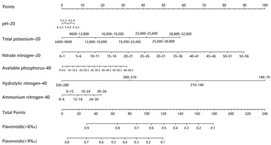 Nomogram model predicts the relationship between the range of variation in six strongly correlated factors and their corresponding flavonoids content.