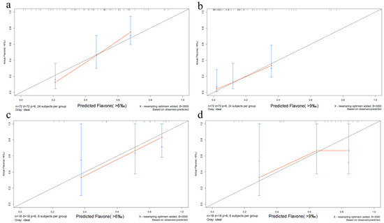 Calibration curve. (a) shows the calibration curve of the training set when the flavonoids content is >6‰, (b) shows the calibration curve of the training set when the flavonoids content is >9‰, (c) shows the calibration curve of the validation set when the flavonoids content is >6‰, and (d) shows the calibration curve of the validation set when the flavonoids content is >9‰. In these figures, the diagonal dotted line represents a perfect prediction by an ideal model, and the orange solid line represents the performance of the nomogram model, of which a closer fit to the diagonal dotted line represents a perfect prediction by an ideal model.