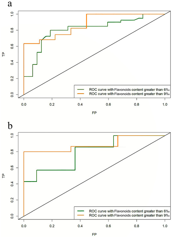 Since the ROC curve cannot quantitatively evaluate the model performance, the model performance is evaluated by calculating the area under curve (AUC) [44]; the area under the ROC curve reflects the classification ability, with a larger value indicating a stronger classification ability. It is generally considered that, when the AUC value is ≥0.7, it indicates that the model has good differentiation ability. When the flavonoids content is above 6‰ in this model, the AUC values achieved for the training set and validation set are 0.8121 and 0.792, respectively. However, if the flavonoids content surpasses 9‰, the AUC values for the training set and validation set improve to 0.877 and 0.889, respectively. These results indicate that the model’s prediction performance, as shown in in Figure 5, is promising, as the AUC values for both sets are above 0.7 (Figure 5a shows the training set and Figure 5b shows the validation set).