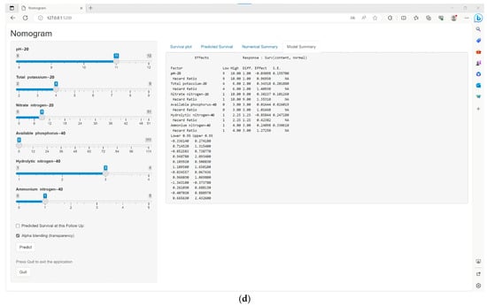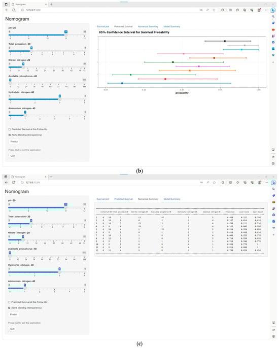 In Figure 6b, the survival module’s predicted values are visibly depicted as co−ordinates on the graph. When the mouse cursor is positioned over a particular point, the corresponding values for pH−20, total potassium−20, nitrate nitrogen−20, available phosphorus−40, hydrolytic nitrogen−40, ammonium nitrogen−40, prediction, lower bound, and upper bound are all displayed on the chart. Up to 11 predictions can be shown in the table at the same time, and predictions exceeding this number will overwrite the initial prediction.