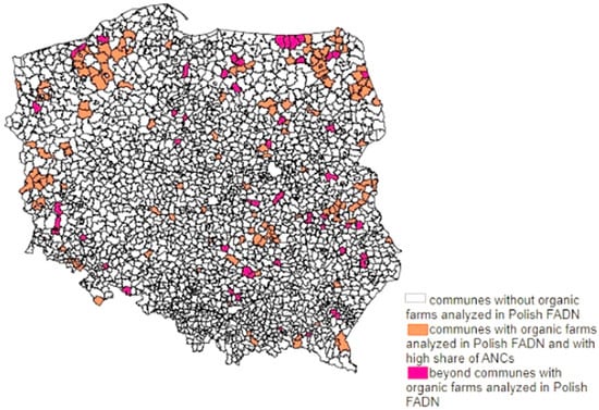 In Poland, farms operating in areas with a high share of ANCs are distinguished by two features, as compared to farms in other areas. The first is not only the poor quality of soil, but also the often smaller share of arable land and large permanent grasslands, as well as the location in communes with a large share of areas with agriculture meeting the characteristics of High Nature Value farmlands (HNVfs) in communes. The second feature of farms operating in areas with a high share of ANCs is expressed in the faster development of organic farming. It is evidenced by the fact that in 2014–2022, in the area of the communes, 71.6% to 74.8% of the total area of UAA with organic farming supported under the CAP 2014–2020 was located. Moreover, the share of area devoted to organic production in communes with a high share of ANCs was more than twice as large as in communes with more favorable conditions. A probable and important cause of the phenomenon was the possibility of obtaining subsidies for organic farming provided under the CAP 2014–2020. Organic subsidies are able to, first of all, improve the income of farms operating on ANCs in the situation of their limited ability to intensify conventional production. Similar findings result from the analyses of Kołoszko-Chomentowska []; they pointed out that public funds under environmental measures, including organic farming, are an important and sometimes leading source of income for farms in these areas. These opinions are continued in the research of Jansky et al. [], Haring and Offermann [], Kallas et al. [] and Perpar and Udovc [], according to whom organic farming supported by public funds is an important opportunity for the operation of farms in ANCs.