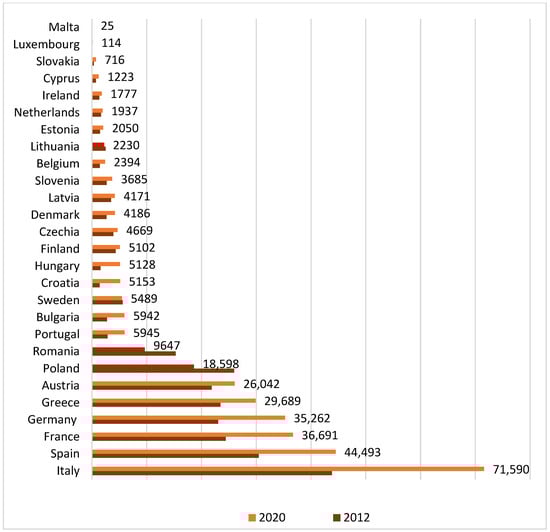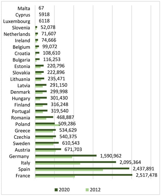EU agriculture is diverse, also in the field of organic farming [,,]. The differentiation is evidenced by both the absolute and relative difference in the area of organic UAA, as well as the pace of change in this respect in individual EU Member States (Figure 2 and Figure 3).