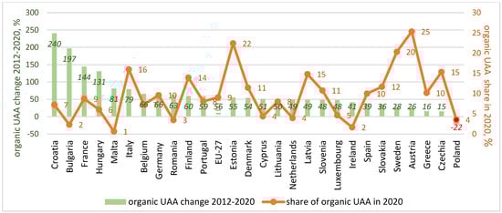 The change in organic utilized agricultural area in EU between 2012 and 2020 (%) and percentage of organic UAA in 2020 (%). UAA—utilized agricultural area.