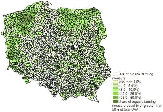 Distribution of area supported under the organic farming measure under the EU CAP by communes in Poland in 2022.