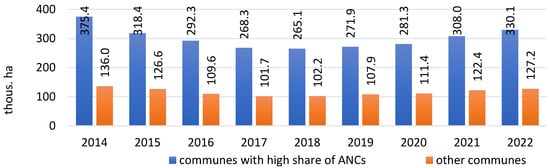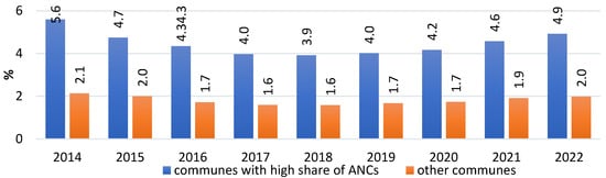 In areas with a high share of ANCs, the coexistence of diversified plant production with structural plants on arable land and animal production on permanent grasslands is one of the basic conditions for conducting profitable agricultural production. It then ensures optimal soil protection by maintaining and increasing their fertility, including through the use of natural fertilizers, as well as ensuring the good condition of the landscape, including by grazing animals. In this context, organic farming under the EU CAP has a lot to offer. This opinion is confirmed by the fact that in 2014–2022, 71.6% to 74.8% of the total area of UAA with organic farming supported under the CAP 2014–2020 was located in communes with a high share of ANCs. In addition, its share in the total area of UAA ranged from 3.9 to 5.6%, while in the remaining communes, it ranged from 1.6 to 2.1% (Figure 6, Figure 7 and Figure 8).