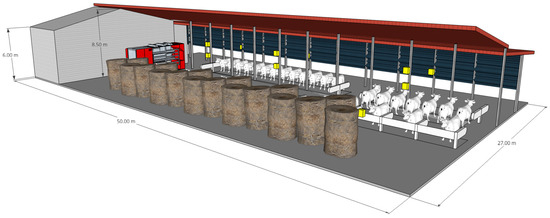 The work focuses on a case study building officially involved in a scientific collaboration with the University of Bologna. This farm served as an experimental site for collecting data and monitoring various parameters related to the environment, production, and animal behavior. The farm is located in Budrio, a municipality in the metropolitan city of Bologna, Emilia-Romagna, Italy. The geographical coordinates are 44°33′32.7″ N 11°31′09.7″ E, with an elevation of 25 m above sea level. The dairy cattle barn (Figure 1) has a rectangular plan layout with dimensions of 50 m in length and 27 m in width. The roof height varies from about 6.0 m at the eaves to 8.5 m at the ridge. The building has a steel frame structure with a double pitched roof made of insulated metal panels. Within the barn, there were about 70 Holstein-Friesian lactating cows and 15 dried cows.