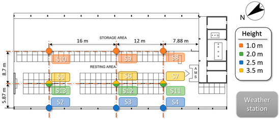 Hourly data of indoor temperature over the timespan from 1 September 2022 to 26 June 2024 were collated by 12 transducers from TE Connectivity, distributed in groups of three and positioned at 1.0, 2.0, 2.5, and 3.5 m high to cover the internal zones sensitive to temperature changes inside the barn (Figure 2). The main parameters of the HTU21D(F) temperature sensor have an operative range going from −40 to +125 °C with an accuracy of ±0.3 °C and a resolution of 0.04 °C.