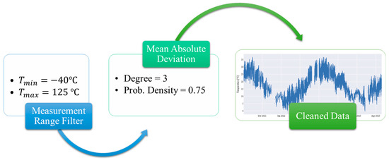 Missing values and outliers are one of the most challenging errors present in time series because, despite the existence of several algorithms that allow their elimination, an a priori knowledge of the data and their normal behavior is required to make correct estimates based on the erroneous data. To deal with outliers, a cascade of two algorithms has been implemented (Figure 3), first filtering the data according to the measurement range of the sensor, and then applying the mean absolute deviation algorithm with the aim of eliminating the values that, although within the measurement range of the instrument, do not correspond to the difference of each data point from the mean.