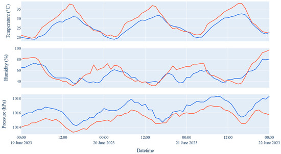 To effectively use Prophet, input data are required in the form of a Pandas Dataframe containing two crucial columns: a “ds” column indicating the time stamps of the time series, and a “y” column representing the corresponding numerical values to be predicted [18]. In order to increase the accuracy of the predictions calculated by the Prophet model, in addition to the target variable labeled “y”, which in our case is the indoor temperature, additional regressors, also known as exogenous variables, are set, which in our case correspond to the outdoor temperature, outdoor relative humidity, and outdoor atmospheric pressure provided by Open-Meteo. It is necessary to note that these exogenous variables will be used both in the training and in the prediction stages; the former are the historical values stored in the Open-Meteo platform, while the latter correspond to the predictions also provided by the weather forecaster (Figure 6).