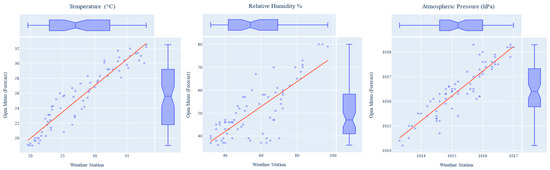 Regardless of the similarity of the comparison of the pairs of variables analyzed (temperature, relative humidity, and atmospheric pressure), a correlation analysis was carried out. For this purpose, the presence of a linear relationship between the variables under study (Figure 5) was first verified. Consequently, the confirmation of an approximate linear relationship allows us to consider Pearson’s correlation as a suitable way to quantify the degree of similarity between the two pairs of variables.