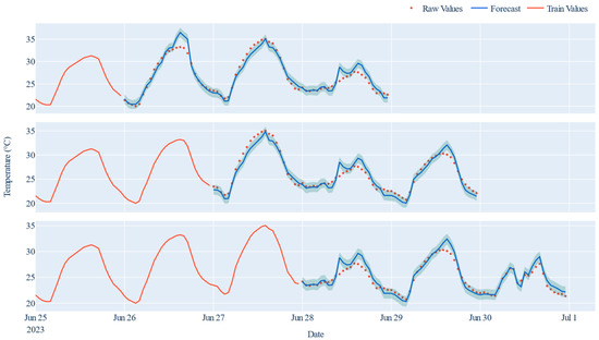An aspect of interest for herd management decisions is the forecast of the internal temperature of a livestock building in temperate climates. However, due to the target variable, short-term predictions are required. Covering a 6-day period from 25 June 2023 to 1 July 2023, Figure 8 contrasts the raw temperature values, denoted by blue dots and light blue connecting lines, with the forecasted temperatures elegantly represented by a smooth red curve. To get an idea of the model performance, an uncertainty interval corresponding to 80% of the quantile was calculated for each accuracy. In addition, the subsequent raw values were added to the graph.