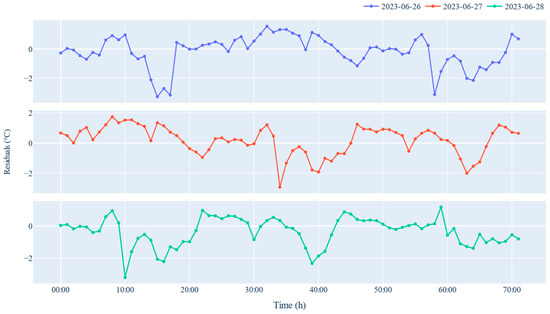 It is possible to see that the model overestimates the high temperatures, around 15:00 every day, from the visual inspection of Figure 8. This is one of the requirements of predictive models for this type of performance since it overestimates the high temperatures to tolerate fluctuations in the real values without arriving at heat stress values for the herd. An analysis of the residuals was also performed to examine in detail the differences between the estimated values and the actual values. In this case, Figure 9 plots the residual corresponding to the three predictions on the same abscissa axis. It should be noted that, as mentioned above, the largest differences are of negative sign, where the model overestimates the high temperatures. Once again, the acceptable behavior of the model for the current application context is confirmed.