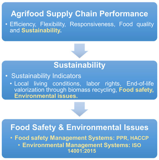 Sustainability, broadly defined, focuses on enhancing people’s quality of life by considering social, economic, and environmental perspectives and ensuring this improvement for future generations [15,16]. The concept of sustainability arises from the four dimensions within the ASC performance [17]. The ASC covers all activities related to agricultural food handling, from producers and farmers to end consumers [18]. Aramyan et al. (2007) identify four primary performance dimensions: efficiency, flexibility, responsiveness, and food quality [17]. Moreover, an additional category is introduced to address critical aspects reflecting the social and environmental dimensions of sustainability [19]. Refining the sustainability dimension, Gold (2017) outlines indicators such as local living conditions, labor rights, land rights, end-of-life valorization through biomass recycling, environmental issues, and FS [12]. Consequently, agri-food industries allocate a substantial portion of their resources toward advertising and marketing initiatives focused on sustainability [20,21]. The ASC consumes natural resources and often causes environmental deterioration of the natural ecosystems where it develops. From this point of view, FS and EM play an important role in the sustainability of the environment where agro-industrial activity takes place [22]. According to Kumar (2022), FS and EM topics such as waste management or environmental impact assessments are two of nine key thematic research themes in sustainable food supply chains [23]. Figure 1 displays an interpretative diagram that, from a scientific perspective, grounds the reason why the evaluations of FS along with EM stand as quantitative pillars in achieving sustainability within the ASC.