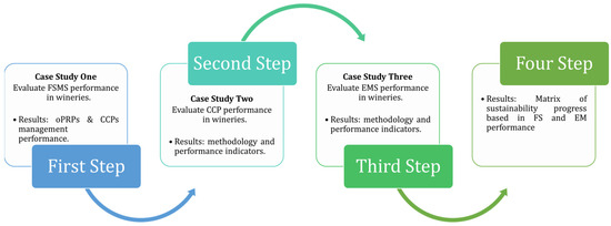 The methodological approach was structured in four well-defined steps. The first three steps were dedicated to analyzing different case studies. The first step laid the groundwork for defining the objectives of the second case, which focused on FS, while the results of the second supported the methodology to develop the indicators in the third study, which focused on EM. In each of these stages, the efficacy with which the wineries implemented the FSMS or the EMS was meticulously evaluated. The four steps involved synthesizing the three investigations to develop an FS and EM sustainability matrix based on performance indicators calculated from the results of case studies two and three. Through detailed statistical analysis and the examination of these cases, the research offers a deep dive into the sustainability practices within the wine sector based on FS and EM. Figure 2 shows the evolution of this methodological approach, inclusive of the interconnections among the steps and their congruence with the theoretical framework. The outcomes of the first case study facilitated the identification of CCPs that were inadequately managed by the wineries and the principal components that support the wineries’ performance in FS management. Leveraging these findings, the second case study delineated performance indicators for the components identified in the first phase. The third case study delved into the EM practices by examining the EMS components based on the ISO 14001:2015 standard and employed the proposed methodology to compute the indicators from the second phase to formulate performance indicators in EM. The fourth step focused on combining the findings from the three previous investigations to create a sustainability matrix based on FS and EM.