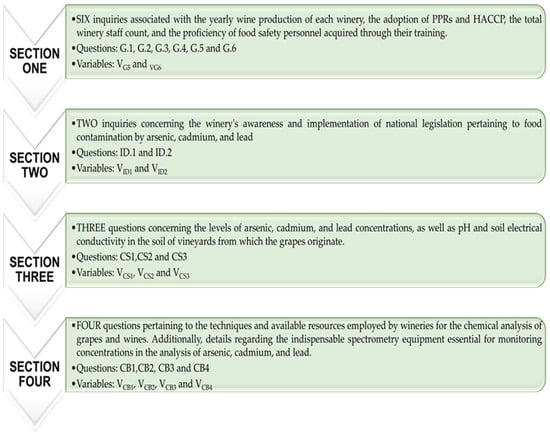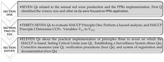In the initial phase, a first case study was conducted to evaluate the effectiveness of the FSMS based on PRPs and the HACCP in twenty-one wineries with the Protected Designation of Origin “Vinos de Madrid”. The performance of these wineries was thoroughly assessed at various stages of the wine production process, focusing on Critical Control Points (CCPs) or operational prerequisite programs (oPRPs), including the implementation of PRPs and adherence to HACCP principles [39]. This research utilized a structured survey with fifty-five questions grouped into eleven sections. The questions employed both yes/no and multiple-choice options, with quantitative variables assigned using Likert scales. Figure 3 illustrates the questionnaire structure, detailing questions and assigned variables for the statistical process. The questionnaire is included in Appendix A.