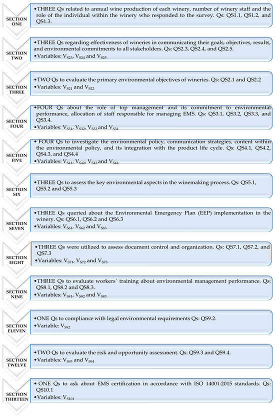 A third case study extended its scope to Italian wineries, focusing on their EMS. Conducted between June and November 2022, the survey involved a sample of 120 wineries from various regions in Italy, with the subsequent data analysis using statistical tools such as SPSS and Excel. The comprehensive questionnaire, featuring thirty-two questions in closed and open-ended formats, Likert scales, and multiple-choice options, explored aspects like winery characteristics, environmental objectives, top management involvement, communication strategies, and emergency plans. The questionnaire was distributed to a non-probabilistic sample of Italian wineries, resulting in responses from thirty-four wineries. Figure 5 provides an overview of the questionnaire structure, including questions and variables. The questionnaire is included in Appendix A.