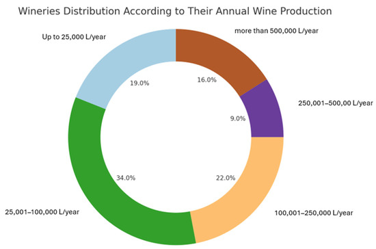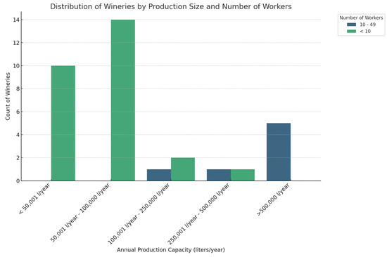 Figure 8 illustrates the wineries’ distribution by production capacity, segmented by the number of workers, providing a layered perspective on the operational characteristics of the wineries involved in our survey. This visualization highlights the variance in production capacities, from less than 50,001 L per year to more than 500,000 L per year, and elucidates the corresponding workforce sizes, revealing the diverse approaches to production and manpower management across the sector.