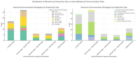 Additionally, the strategic use of environmental communication stands out as a hallmark of larger wineries’ EM efforts. A significant 90% of these wineries employ a diverse array of communication channels, both internal and external, to promote environmental awareness and report on sustainability initiatives. This includes the extensive use of digital platforms such as company websites, social media, and specialized environmental reports, ensuring a broad reach and engagement with various stakeholders, from employees and customers to regulatory bodies and the wider community. Figure 10 provides a clear depiction of how wineries communicate their environmental performance internally and externally, emphasizing the prevalence of digital and electronic communication methods in their communication practices.