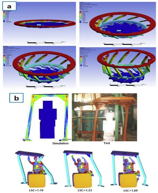 - Chen, C.; Wang, G.; Zhang, Y.; Zhang, Y.; Si, J. Effect of Lateral Stiffness Coefficient of Loader ROPS on Human Injury in a Lateral Rollover Incident. Biosyst. Eng. 2012, 113, 207–219. [Google Scholar] [CrossRef]