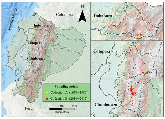 Geographical map of Ecuador indicating the collection sites of quinoa (Chenopodium quinoa Willd.) landraces in three provinces (Imbabura, Cotopaxi and Chimborazo) of the Ecuadorian Andean region and at two different times (Collection A and Collection B).