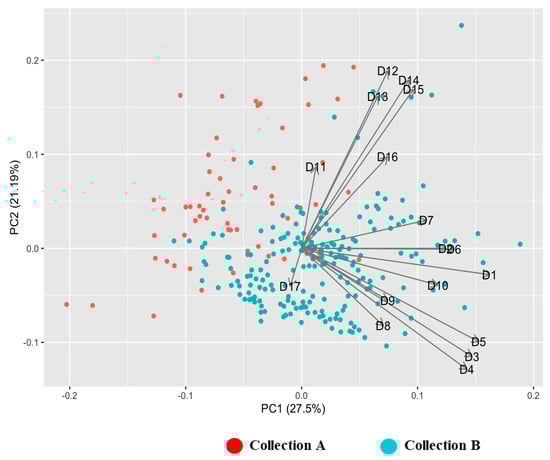When the two collections were compared using a principal component analysis, it was found that 48.69% of the total variance could be explained by the first two components (PC1 = 27.50% and PC2 = 21.19%; Figure 2). The variables that best defined the accessions of Collection B were related to the plant height (D1), leaf length and width (D4 and D5), petiole length (D3) and panicle length (D6), with values higher than those of the Collection A accessions. Meanwhile, the variables associated with different phenological stages (D11 to D17), which preferentially grouped the accessions from Collection A, showed that they were generally earlier maturing quinoas than those from Collection B.