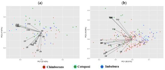 On the other hand, the principal component analysis showed that 45.09% of the total variance in the accessions in Collection A was explained by the first two components (PC1 = 27.42% and PC2 = 17.67%), while in Collection B, the first two components explained 48.39% (PC1 = 30.01% and PC2 = 18.38%) of the total variance (Figure 3a,b). The variables that contributed most to the variation of PC1 in Collection A were those associated with days to flowering and physiological maturity (D12 to D16), which differentiated the accessions of Cotopaxi and Imbabura from those of Chimborazo. Likewise, the variables grain width (D8) and 1000-grain weight (D9) also contributed significantly to the distinction between accessions. In Collection B, a high correlation was also observed between the variables related to flowering and physiological maturity, which in this case, helped to separate some Cotopaxi accessions from the rest. On the other hand, the petiole length (D3), leaf length and width (D4 and D5) and grain width (D8) were the ones that best grouped the Chimborazo accessions, while the harvest index (D17) was the trait that best distinguished the Imbabura accessions. In general, there is no clear differentiation in the accessions according to their geographical origin in both collections.