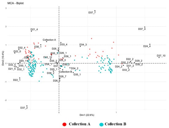 Multiple correspondence analysis biplot for the 268 quinoa accessions and the two collections (A and B) using the qualitative descriptors (D18 to D40).