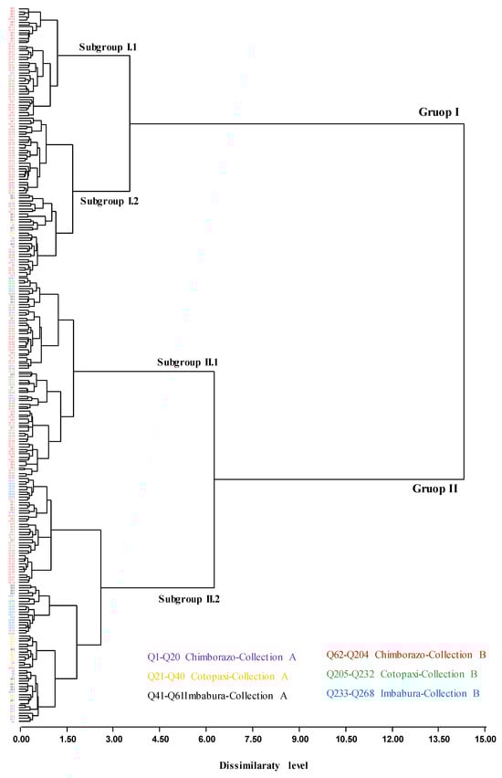 Ward’s hierarchical clustering dendrogram showing the phenotypic relationships among the 268 quinoa accessions (Q1 to Q268) collected in the provinces of Chimborazo, Cotopaxi and Imbabura, from Collection A and Collection B. It is based on data from 17 quantitative and 18 qualitative descriptors using the Gower’s distance.