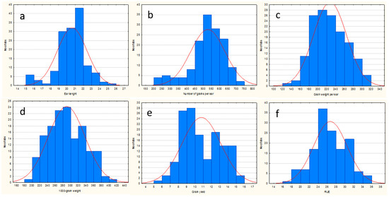 Figure 2. Frequency distribution curve for ear length (a), number of grains per ear (b), grain weight per ear (c), 1000-grain weight (d), grain yield (e), and rain use efficiency (RUE) (f).
