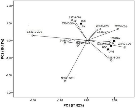 Figure 3. A principal component analysis of the maize ear length (EL), number of grains per ear (NGE), grain weight per ear (GWE), 1000-grain weight (1000-GW), grain yield (GY), and rain use efficiency (RUE) influenced by hybrids (ZP 500, NS 5010, and AS 534) and crop densities (CD1—50,125 plants ha−1, CD2—59,523 plants ha−1, CD3—69,686 plants ha−1, and CD4—79,365 plants ha−1).