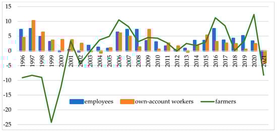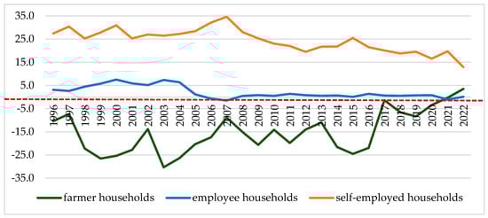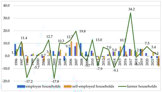 Analysis of the variability of the average monthly available income per person in various socio-economic groups of households reveals the high instability of the farmers’ incomes (Figure 3). This is visible on the scale of agricultural households’ income fluctuation, but also when comparing its variability with the variability of the income of other households. In the period 1996–2022, the average rate of change in the real income of farmers, year-on-year, was as high as 8.8% and it was almost 2.5 times higher than the average rate of change in the income of employees’ households and more than 2.0 times higher than the annual average change rate of the available income of self-employed people (Figure 3; Table 2).