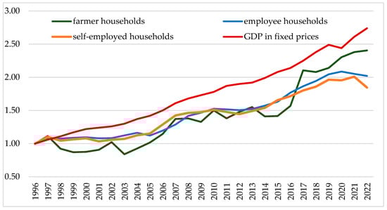 The faster real increase in the income of farmers’ households, in relation to other groups of households, but with a higher variability in the farmers’ incomes, is also confirmed by the observation of the dynamics of household income in Poland against the background of GDP dynamics (Figure 2). The increase in GDP in Poland in the period 1996–2022 was accompanied by an increase in household income, yet the rate and scale of the increase for households living off of income sources in nominal and real terms was lower than the GDP dynamics. This means that labour was relatively depreciated with respect to the remaining production factors influencing the income distribution in the economy.