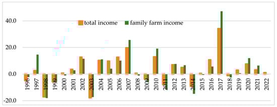 The annual average change rate of available income, in absolute values for the overall income, amounted to 8.1%, whereas for farm holdings it amounted to 10.1% (Figure 4). From this it follows that, in farmers’ households, income from non-agricultural sources could be an element stabilizing the variability of their total income. This is further confirmed by the study by J.S. Zegar [46], which showed that obtaining income outside of a farm holding significantly alleviates the variability of their income for farming families.