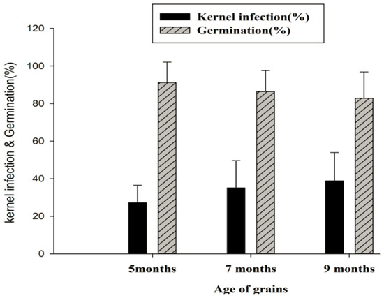 - Habib, A.; Sahi, S.T.; Javed, N.; Ahmad, S. Prevalence of seed-borne fungi on wheat during storage and its impact on seed germination. Pak. J. Phytopathol. 2011, 23, 42–47. [Google Scholar]
