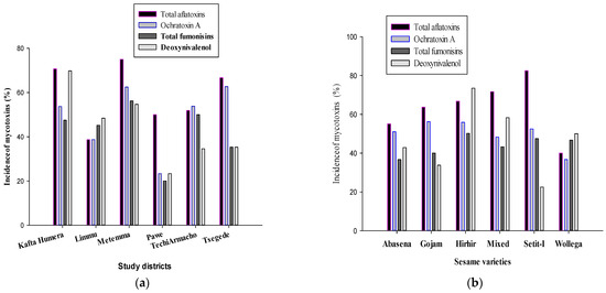 3.3. Occurrence of Mycotoxins in Sesame across Varieties and Districts in Ethiopia
