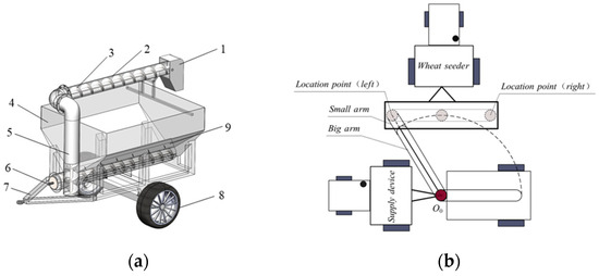 Replenishment device solution. (a) Structure of the supply device, 1. small arm (discharge port), 2. big arm, 3. spiral conveyor auger, 4. bin, 5. waist joint, 6. auger power shaft, 7. articulated frame, 8. wheel, 9. adjustable feed port; (b) principles of seed-box replenishment.
