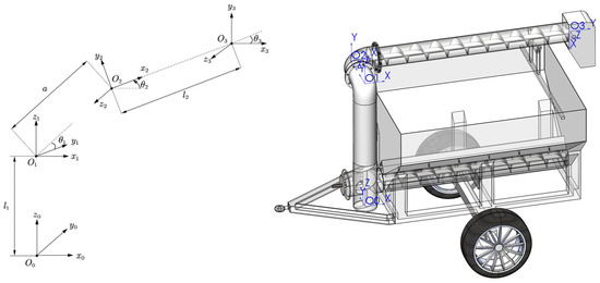 The working principle of the supply device is shown in Figure 2b. First, the supply vehicle is pulled by a tractor to the area behind the seed box of the seeder. At the same time, the vehicle’s body is parallel to the seed box, and the point O0 of the waist-joint axis is located in the middle of the width direction of the seed box. The supply-robot arm first moves to the right positioning point, and with the cooperation of the three joint angles, the discharge port moves along the center line of the seed box to the left positioning point. At the same time, the screw conveyor works to continuously output seeds. After reaching the preset supply amount, the screw conveyor stops, and then the supply-robot arm is reset, the seed-box cover of the seeder is closed, and the supply operation is completed. The structural parameters of the seed-box supply device are shown in Table 1.